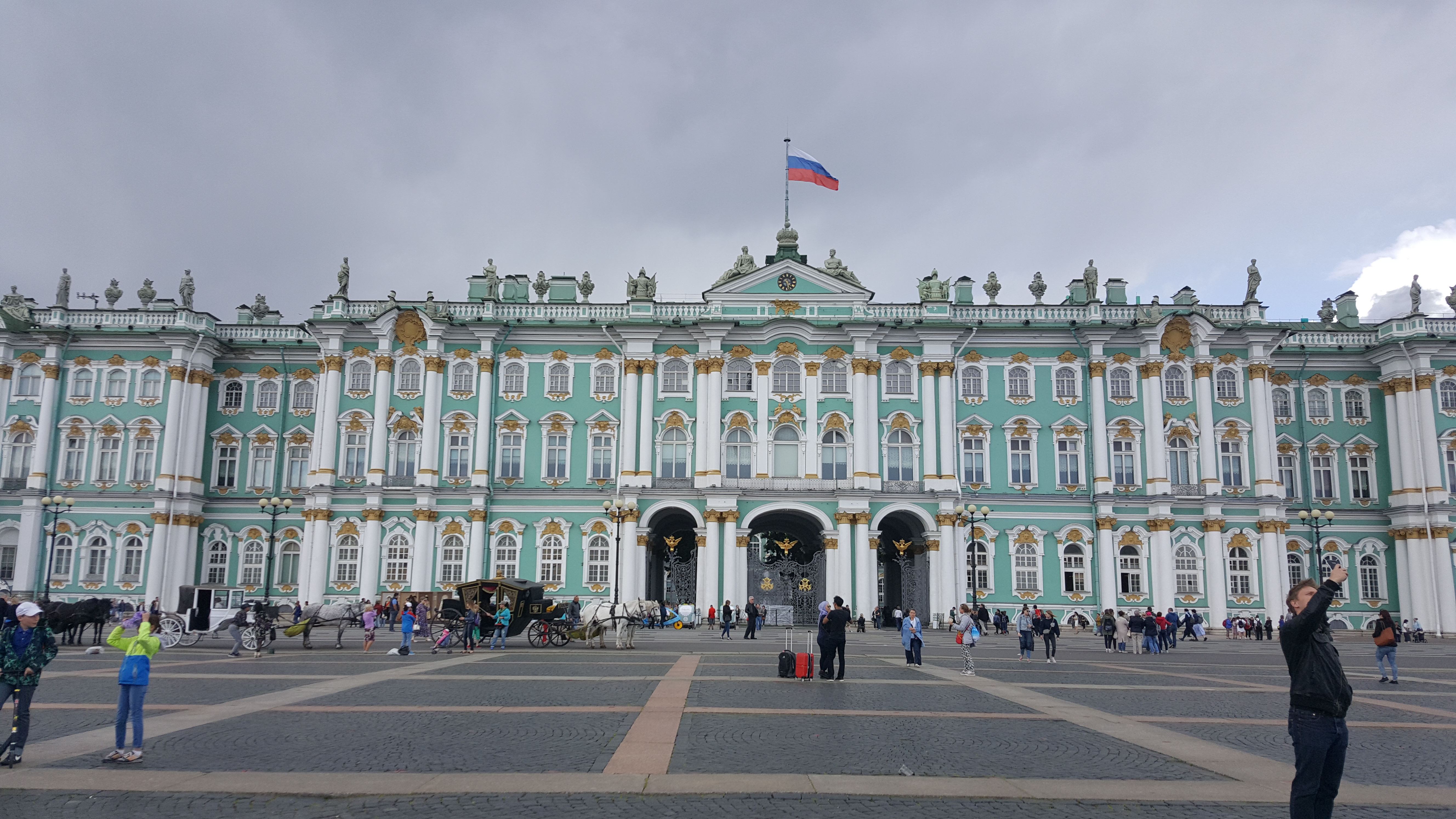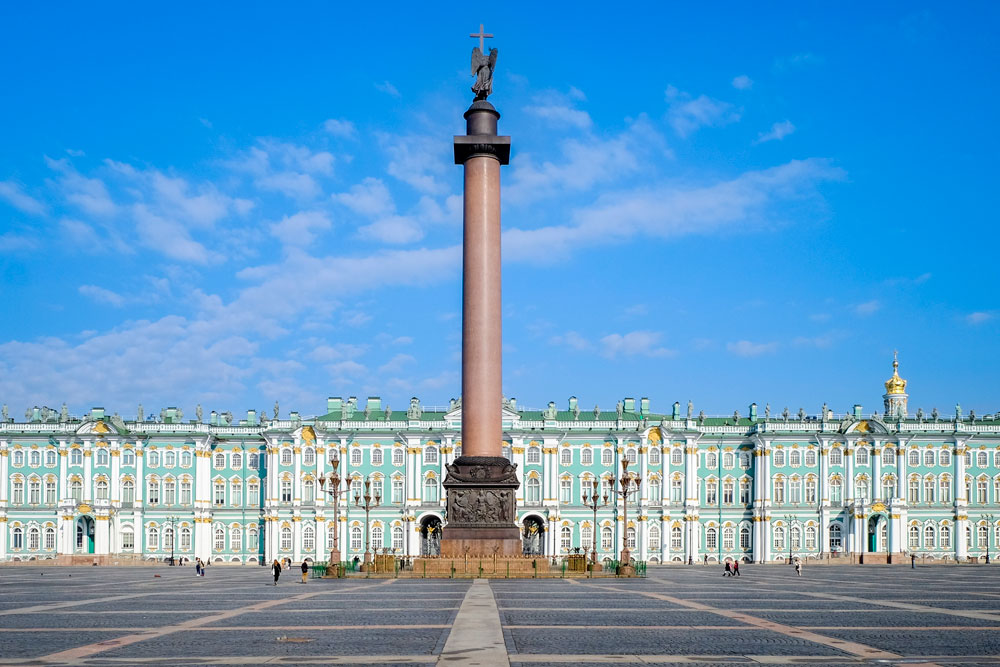 Sulla Piazza del Palazzo sorge il Palazzo di’Inverno, la residenza degli zar, opera di Bartolomeo Rastrelli. In stile barocco russo si allunga per 230 metri sulla riva sinistra del Neva; ha 1057 stanze, 117 scaloni e 2000 finestre. L’edificio del Palazzo d’Inverno, insieme ad altri quattro contigui, ospita il Museo dell’Ermitage, formato nel 1764, quando Caterina II acquistò 226 quadri.