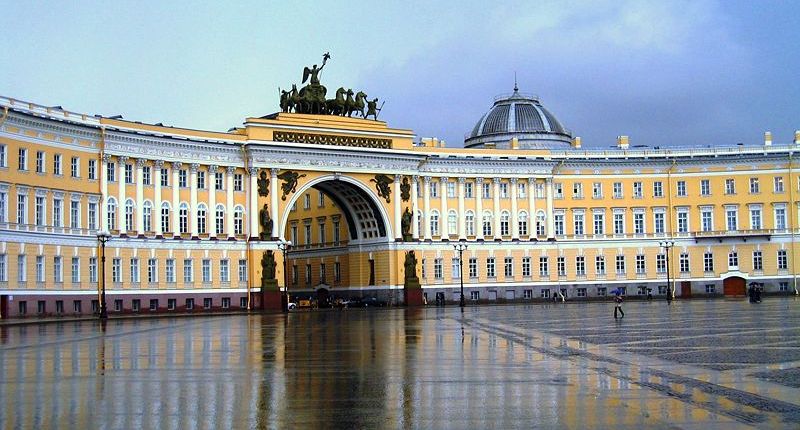 Il palazzo dell’ex-Stato Maggiore, in stile neoclassico, è costituito da due ali separate da un arco trionfale, sormontato da un carro commemorativo della vittoria russa su Napoleone.