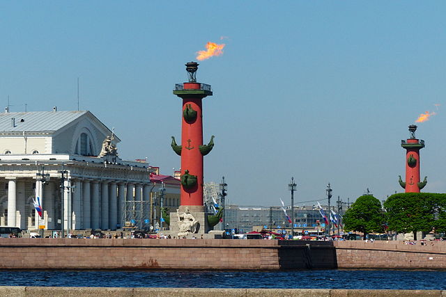 Di particolare importanza e suggestione appaiono le due colonne rostrate, commemorative delle vittorie navali russe. Si tratta in realtà di due ex fari posti all’entrata del porto cittadino, su cui oggi, nei giorni di festa, ardono le fiaccole.