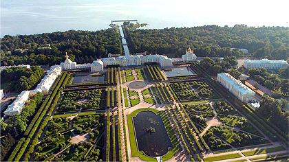 La tenuta comprende i Giardini Inferiori, i Giardini Superiori, il Parco di Aleksandra, vari palazzi e più di 140 fontane. Peterhof fu costruito su tre terrazze naturali, al centro del complesso troviamo il Palazzo Grande e di fronte ad esso si può ammirare la Grande Cascata, una delle più imponenti del mondo.