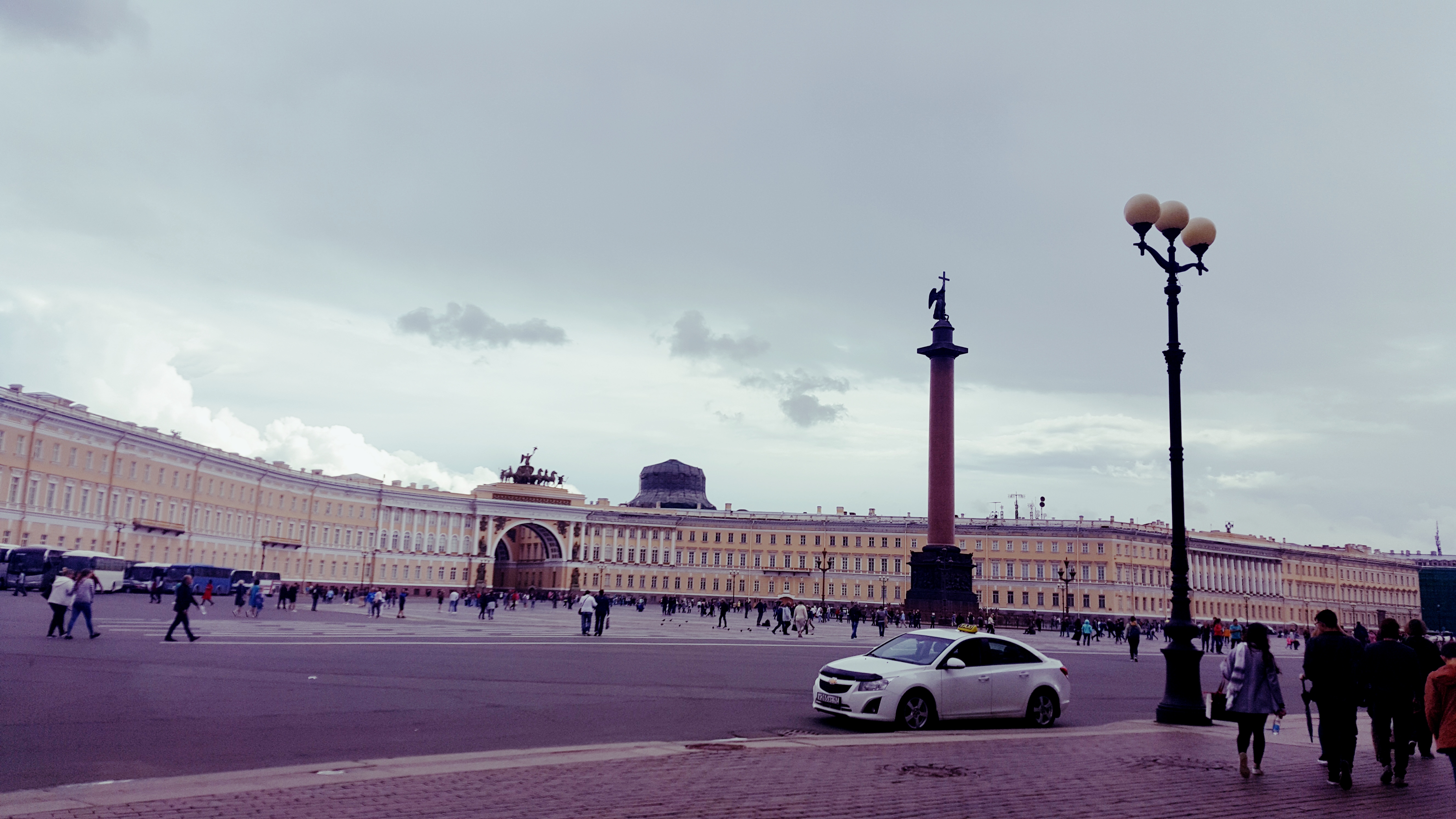 Al centro della piazza si innalza l’enorme colonna di Alessandro, un monolitico di granito rosso, alto 46 metri, coronato dalla figura allegorica di un angelo che schiaccia un serpente. Si dice che l’angelo abbia le sembianze di Alessandro I, il vincitore di Napoleone in onore del quale il monumento fu eretto.