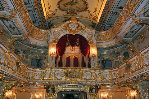 Al suo intero troviamo un teatro privato con decorazioni lussuose.