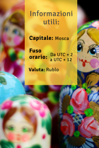 Lo stato russo è diviso geograficamente in due parti, quella europea e quella asiatica. Grazie alla vastità del suo territorio le mete turistiche sono molteplici: come la capitale Mosca con la famosa Piazza Rossa, San Pietroburgo con l’Hermitage e la reggia di Peterhof, la Siberia e la sua incredibile natura o zone più a sud come Sochi, sul Mar Nero al confine con la Georgia.